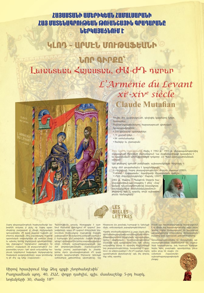 Նոր գրքի շնորհանդես՝ Claude Mutafian, "L'Arménie du Levant (XIe-XIVe siècle)"